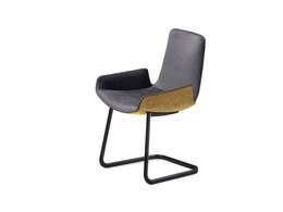 Die vollgepolsterte Sitzschale wird mit wertvollen Stoffen oder elegantem Leder bezogen, wobei sich die Bezugsmaterialien der Vorder- und Rückseite individuell kombinieren lassen. Das Gestell dieses Stuhls kann ebenfalls nach dem persönlichen Geschmack gewählt werden: Elegantes Eichenholz, gebeizt in verschiedenen Farben oder grazile Stahlgestelle, pulverbeschichtet. Unterstrichen wird die konsequente Linienführung des Designs von Birgit Hoffmann und Christoph Kahleyss durch einen Keder, der die Form der Sitz- und Lehnflächen optisch abrundet.