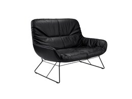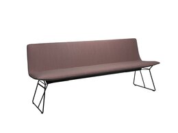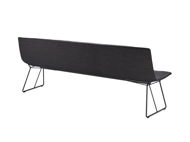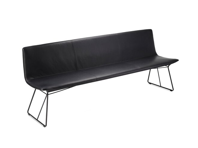 Die vollgepolsterte Sitzschale wird mit wertvollen Stoffen oder elegantem Leder bezogen, wobei sich die Bezugsmaterialien der Vorder- und Rückseite individuell kombinieren lassen. Die Bank der Amelie-Modellgruppe wird von einem filigranen, pulverbeschichteten Drahtgestell getragen, das in vielen Farbtönen erhältlich ist. Unterstrichen wird die konsequente Linienführung des Designs von Birgit Hoffmann und Christoph Kahleyss durch einen Keder, der die Form der Sitz- und Lehnflächen optisch abrundet.