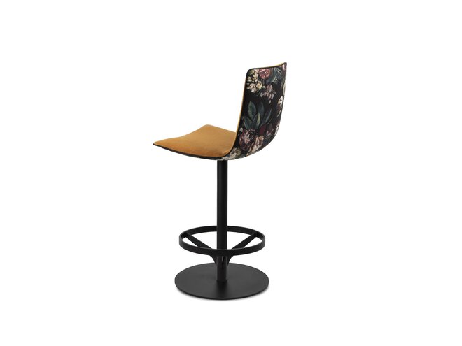 Die vollgepolsterte Sitzschale wird mit wertvollen Stoffen oder elegantem Leder bezogen, wobei sich die Bezugsmaterialien der Vorder- und Rückseite individuell kombinieren lassen. Der Barstuhl der Amelie-Modellreihe ist erhältlich mit einem grazilen Drahtgestell oder einem dreh- und höhenverstellbaren Säulenfuß, beides pulverbeschichtet und in vielen Farbtönen verfügbar. Unterstrichen wird die konsequente Linienführung des Designs von Birgit Hoffmann und Christoph Kahleyss durch einen Keder, der die Form der Sitz- und Lehnflächen optisch abrundet.