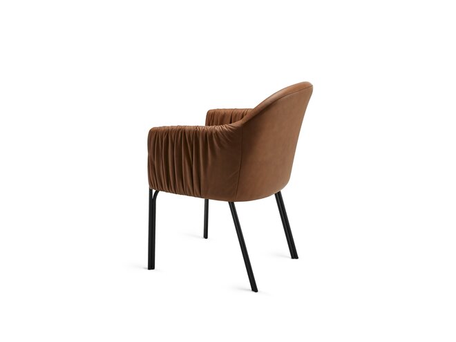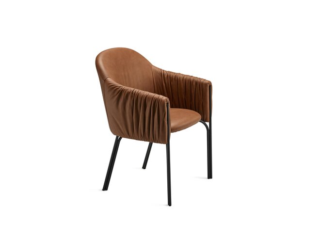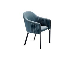 Entstanden ist das Modell Celine, dessen charakteristisches Detail der Übergang von straffem zu gerafftem Material ist. Die hohe Kunst der Mode ist für die Designerin eine Inspirationsquelle gewesen, die Raffung ist angelehnt an elegant hochgeschoppte Blusenärmel. Trotz des opulenten Faltenwurfs strahlt ihr Entwurf Leichtigkeit aus, wozu vor allem die freischwebende Sitzfläche und die filigranen Stuhlbeine beitragen.