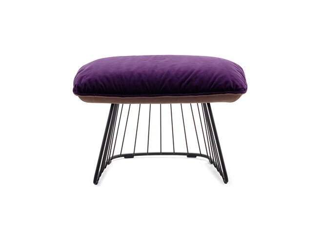 Genau wie die Sitzmöbel lässt sich auch der Ottoman mit Leder oder Textilien beziehen, je nach Vorliebe auch individuell kombiniert an Innen- und Außenseite. Eine Besonderheit ist das harfenartige, grazile Drahtgestell. Erhältlich ist Marla zudem mit eleganten Kufenfüßen.