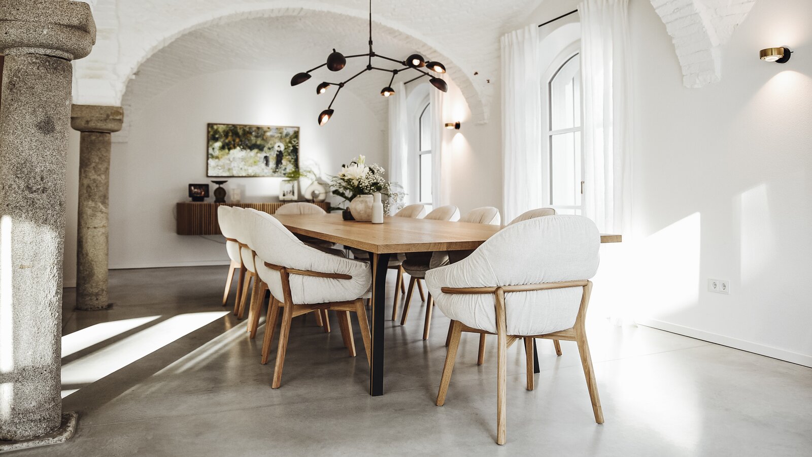 Der Essbereich im Gewölbe ist einer meiner optischen Lieblingsbereiche im Haus – früher funktional als Stall genutzt, heute Lebensmittelpunkt des Hauses. Die charakteristische Architektur verleiht dem Raum eine besondere Ruhe und Klarheit – und der große Tisch lädt dazu ein, lange mit Freunden und Familie zu verweilen. Jede Zusammenkunft hier schafft neue Erinnerungen, und genau das macht diesen Ort so einzigartig.