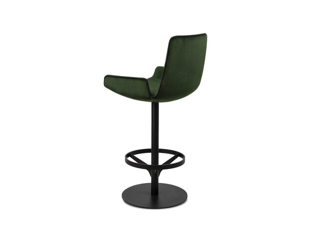 Die vollgepolsterte Sitzschale wird mit wertvollen Stoffen oder elegantem Leder bezogen, wobei sich die Bezugsmaterialien der Vorder- und Rückseite individuell kombinieren lassen. Der Barstuhl der Amelie-Modellreihe ist erhältlich mit einem grazilen Drahtgestell oder einem dreh- und höhenverstellbaren Säulenfuß, beides pulverbeschichtet und in vielen Farbtönen verfügbar. Unterstrichen wird die konsequente Linienführung des Designs von Birgit Hoffmann und Christoph Kahleyss durch einen Keder, der die Form der Sitz- und Lehnflächen optisch abrundet.