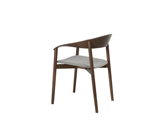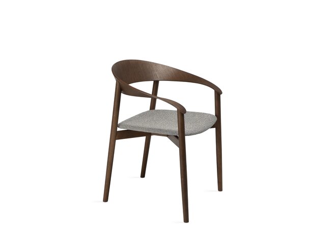 Mit Stella hat der Hannoveraner Patrick Frey ein Möbel entwickelt, das vor allem zeitlos ist. Die Arm- und Rückenlehnen bestehen aus geschwungenem Eichenholz, dessen feiner Bogen sich dynamisch an den Sitzenden anschmiegt. Von diesem Lehnenelement verlaufen die filigranen Füßen, die sich mittig kreuzen und die ergonomisch geformte Sitzfläche tragen.