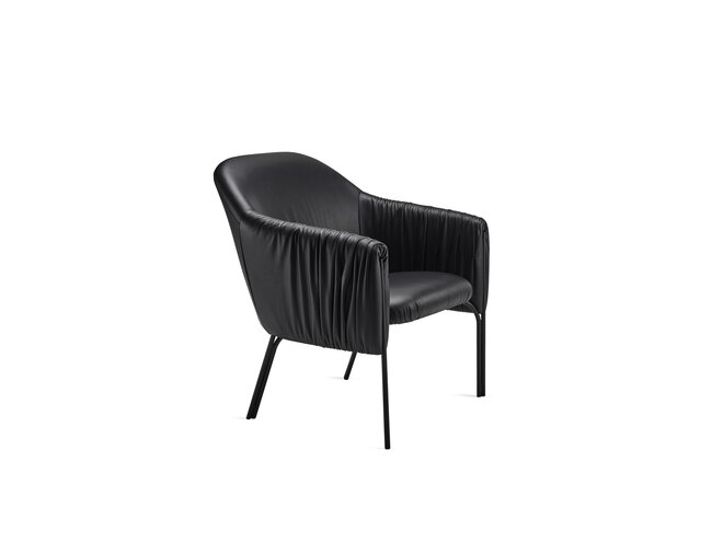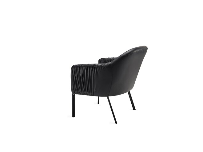 The result is the Celine model, whose most notable detail is the transition from taut to gathered material. The designer found inspiration in haute couture, with the gathered material reminiscent of elegantly pushed-up blouse sleeves. Despite the opulent pleats, her piece radiates a sense of lightness, further enhanced by the floating seat and elegant chair legs.